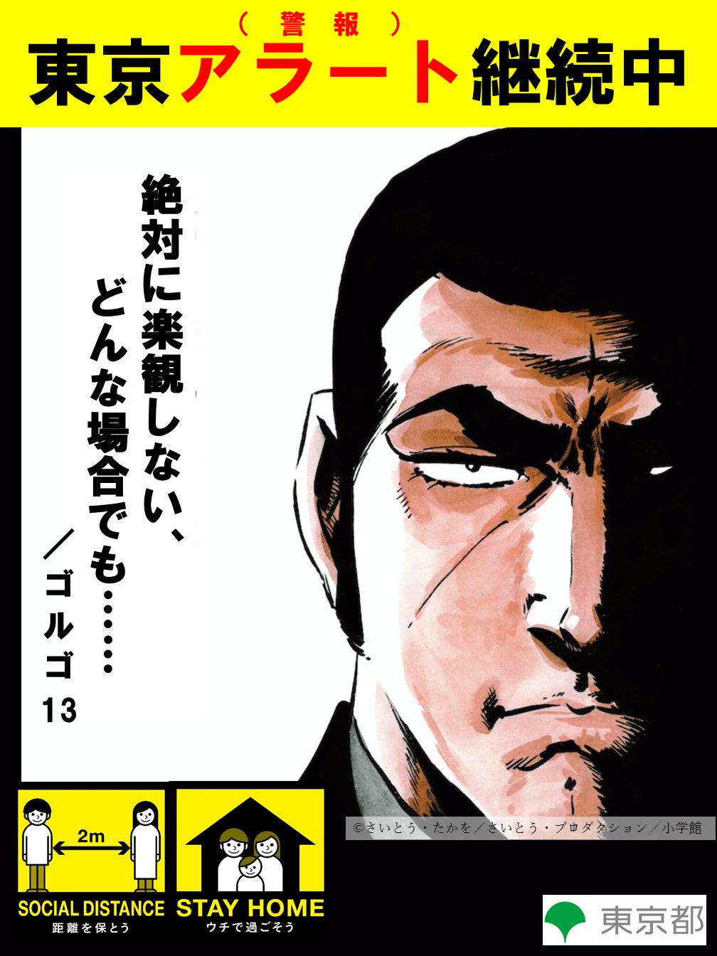 東京都庁広報課 本日のライブ配信 ゲストに劇画家のさいとう たかを様をお迎えして 最新情報をお伝えしました さいとう先生から 新型コロナに関する啓発にご協力をいただけることとなり 東京アラート と ゴルゴ13 のコラボレーションが実現しま